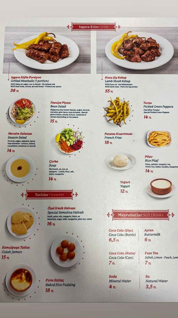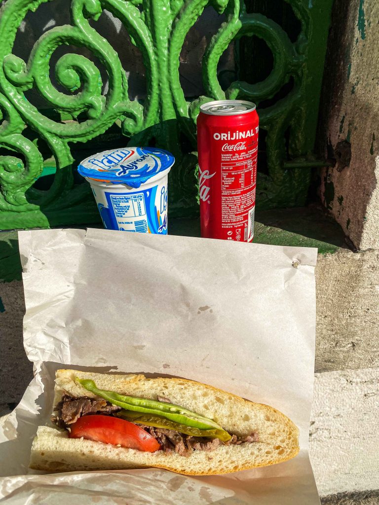 Za pojesti “s nogu” na dosta mjesta naići ćete na kioske s hranom i pićem gdje možete kupiti hamburger ili sendvič već od 9 TL [>1€]. Kava i sladoled su 10 TL [>1€].